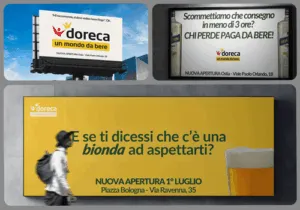 Caso — Doreca. Griglie tipografiche robuste, color coding e fotografia ad alto contrasto permettono di adattare OOH, social e istituzionale mantenendo un unico filo visivo; il logo placement e il rapporto tra immagine e titolazioni sono normati per garantire salienza. (Perimetrato nel set di servizi e portfolio Bliss).